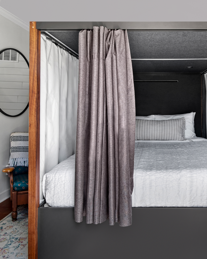 A modern four-poster bed with sound, light, and temperature control for restorative nights and energized days.